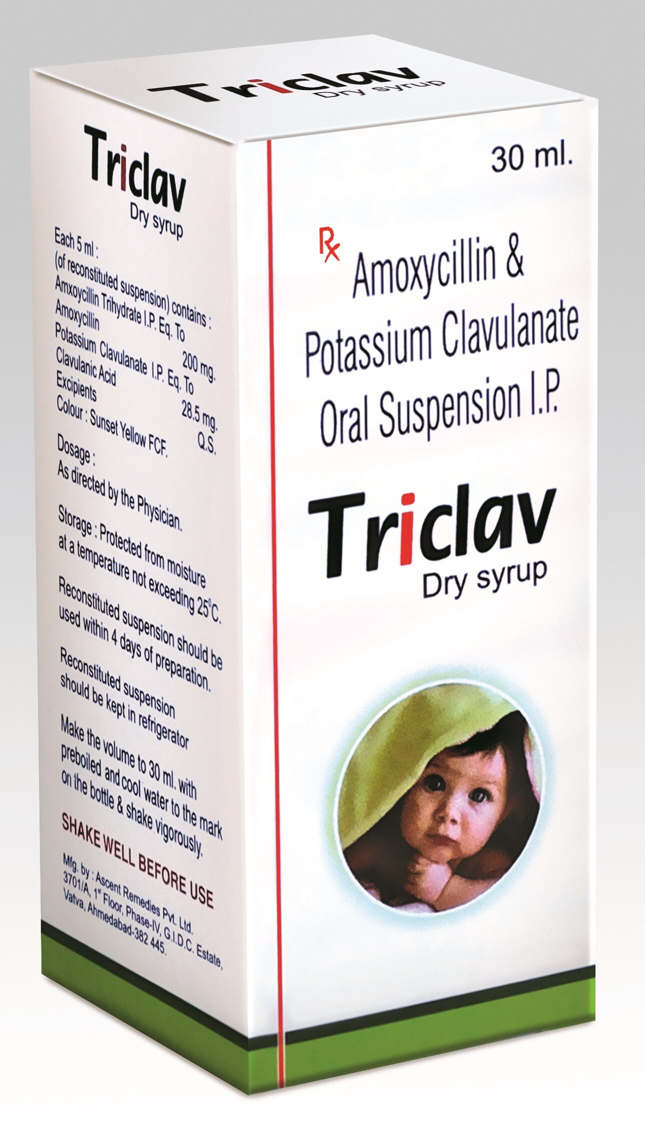 TRICLAV Dry Syrup : Amoxycillin and Potassium Clavulanate Oral Suspension Pharmacopoeal Name : Amoxycillin & Potassium Clavulanate Oral Suspension I.P. Brand Name : Triclav Dry Syrup Composition : Each 5ml (of reconstituted Suspension) contains : Amoxycillin Trihydrate eq.to Amoxycillin I.P. 200mg. Potassium Clavulanate I.P. eq. to Clavulanic Acid 28.5gm Excipients .. Q.S. Colour : Sunset Yellow FCF Therapeutic Uses : Acute otitis media, Acute sinusitis, Chronic bronchitis. Unique Features : Competitive Net Rate Packing Unit : 30ml Pet Bottle with Measuring Cup in a Carton Case Pack : Shrinked Pack of 30 Bottles. 30 ml Angolin Ps t Oa Sispension IP Triclav