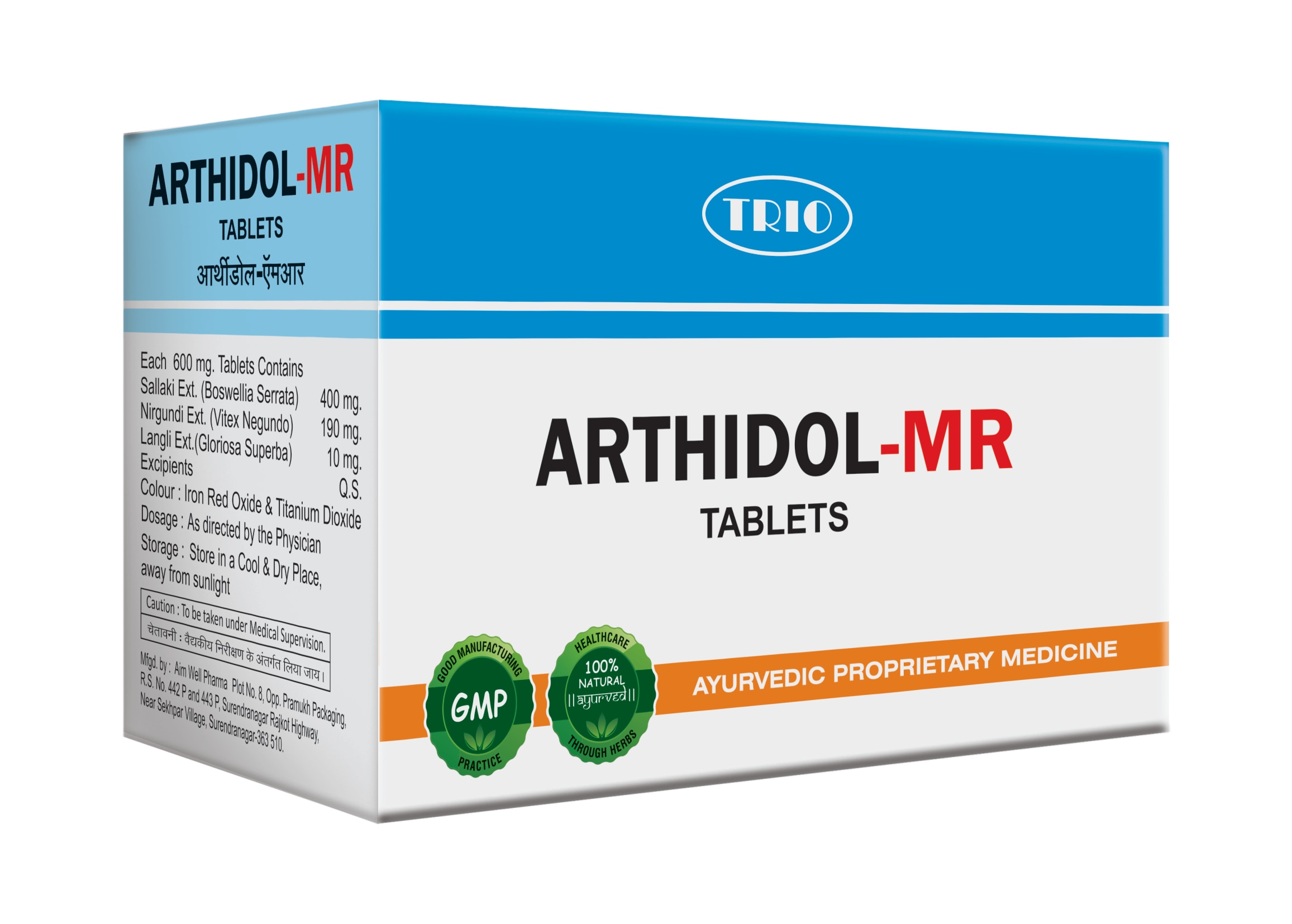 Sallaki Extract, Nirgundi Extract & Langali Extract. Excellent Result in Arthritis. Sallaki Extract, Nirgundi Extract & Langali Extract. Excellent Result in Arthritis. ARTHIDOL-MR tablet is the most reliable and powerful remedy of choice in Rheumatoid Arthritis & Osteo Arthritis. ARTHIDOL-MR is a balanced combination of Shuddha Sallaki, Nirgundi & Langali Extract which is well known for its anti-inflammatory, anti-atherosclerotic and anti-arthritic activities. Shortens the duration of immobility and ensures healthy maintenance of joints by nourishment with vital phyto-nutrients. Increases Osteogenesis (Calcification of Bones) and strengthens skeletal integrity, hence useful in heeling and reunion of fractured bones. Resolves Pain and Inflammation by providing natural anti-inflammatory response which prevents the synthesis of inflammatory mediators i.e. Prostaglandins Powerfully prevents & treats issues with joint deterioration. Protects joints from free radical damage, boosts anti-oxidant joint protection by reverting anti-oxidant enzymes level to near normal. Protects and rejuvenates joint cartilages by decreasing proteoglycan degeneration which decreases cartilage damage. Improves functional performance, acts as muscle relaxant, relieves swelling & inflammation of muscles & joints. Boosts body defense system to maintain joint health and mobility by modulating humeral and cell mediated immune response to aches. Supplements flavonoids, nourishes ligaments & muscles, relieves swelling and other signs of degenerative joint disease.