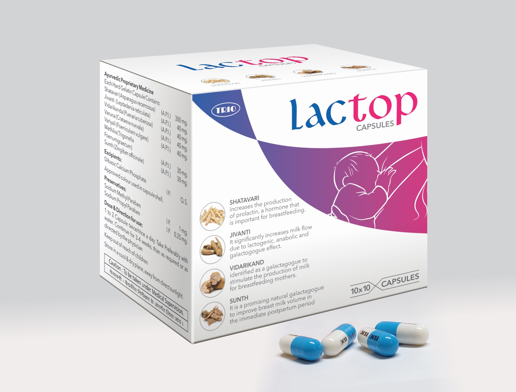 LACOP Capsules : Ayurvdic Medicine for Lactation improvement in Lactating Women. PRODUCT NAME : LACTOP CAPSULES TYPE OF PRODUCT : Ayurvedic Proprietary Medicine CATEGORY : Capsule COMPOSITION : Each Hard Gelatin Capsule contains : SR NO. NAME OF INGREDIENTS FORM OF INGREDIENTS REFERANCE PART USE BOTANICAL NAME QTY 1 Shatavari Powder API Roots (Asparagus recemosus) 300 mg 2 Jivanti Powder API Panchang (Leptadenia reticulata) 40 mg. 3 Vidarikanda Powder API Roots (Pueraria tuberosa) 40 mg. 4 Varuna Powder API Bark (Crataeva nurvala) 40 mg. 5 Variyali Powder API Seeds (Foeniculam vulgare) 40 mg. 6 Methika Powder API Seeds (Trigonella Foenumgraecum) 30 mg. 7 Sunth Powder API Rhizomes (Zingiber officinale) 30 mg.