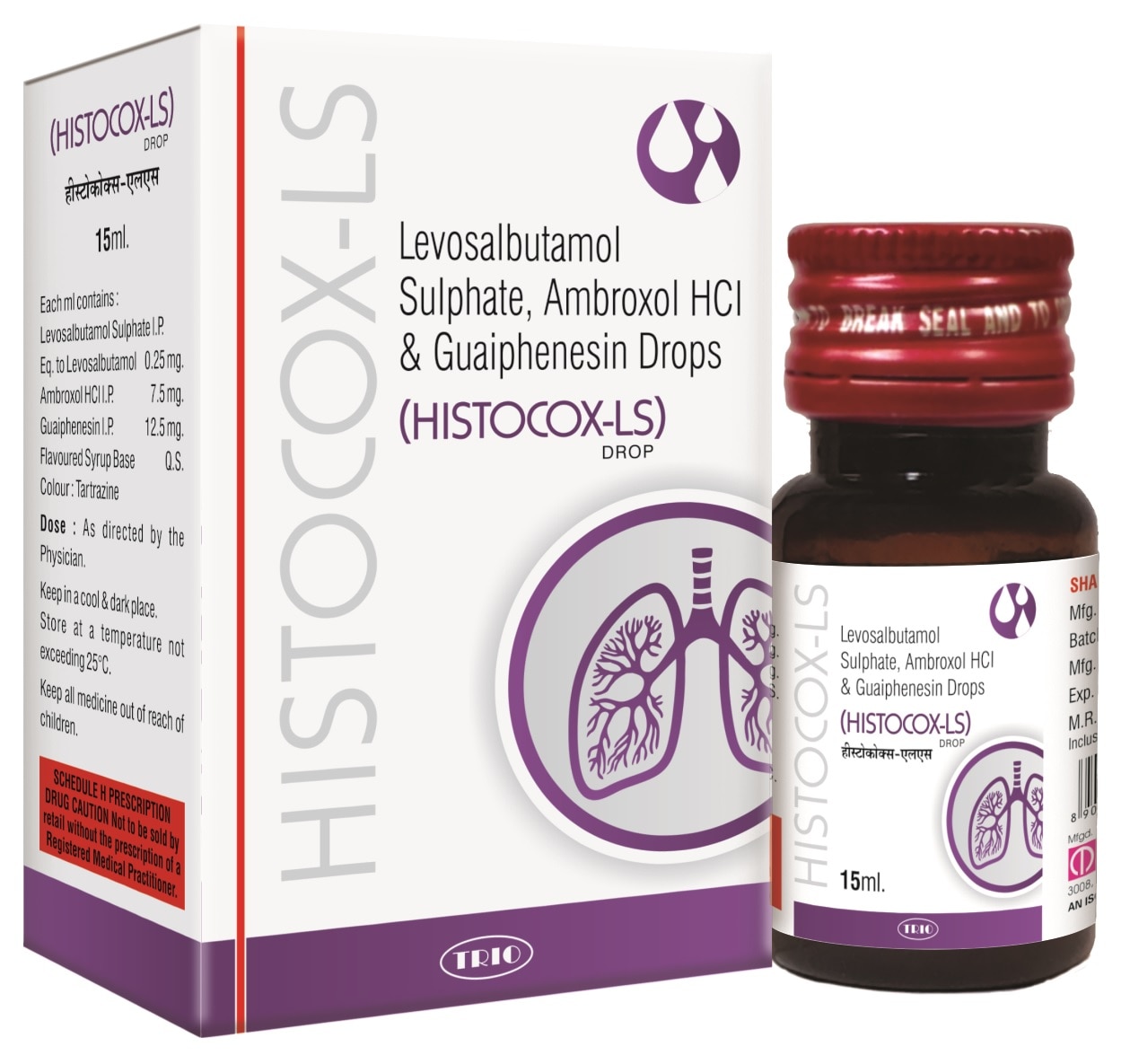 Pharmacopoeal Name : Levosalbutamol, Ambroxol & Guaiphenesin Drops Brand Name : HISTOCOX - LS Drops Composition : Each ml. contains: Levosalbutamol Sulphate IP Equivalent to Levosalbutamol 0.25 mg. Ambroxol Hydrochloride IP 7.5 mg. Guaiphenesin IP 12.5 mg. Flavoured Syrupy base Q.S. Colour : Tartrazine Therapeutic Uses : Unproductive Cough, Whooping Cough, Spasmodic Cough, Dry Cough due to T.B., Dry Cough of any origin. Unique Features : Cough Syrup for Dry Cough Packing Unit : 15 ml Pet ambar coloured Bottle with Dropper & Carton. Case Pack : 30 Bottles shrink Pack. 120 Bottles in a Corrugated Box
